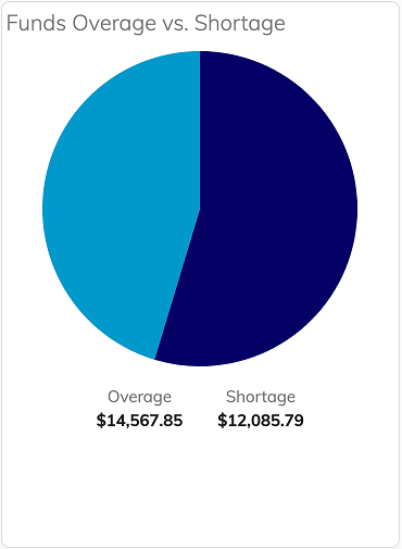 The Over/Short Funds resolution type is particularly important because these cards represent items where the funds need to be sent to or from a customer. Knowing the net number provides important information, but the breakdown of the excess vs. deficit in client funds gives a better picture of the state of your client funds. This dashboard element shows a breakdown of the total overages vs. the total shortages based on the information in the kanban cards.