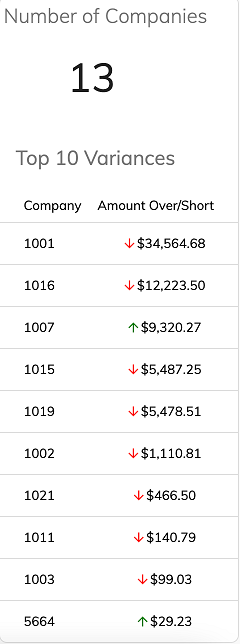 Top Ten Top 10 Variances This dashboard element gives a summary of the top ten companies with overages or shortages, as defined by the Over/Short Funds resolution type on the kanban board.