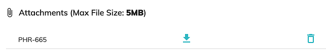 Attach documents to the card either by using the Attachment icon in the Card Header Icon section or by attachments section near the bottom of the card (Max File Size: 5MB). Attachments can also be downloaded or deleted here.