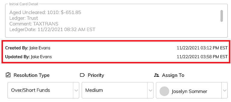 The detailed card view included information about who created the card, including the created date as well as the last user to modify the card, including the date and time stamp it was last modified.