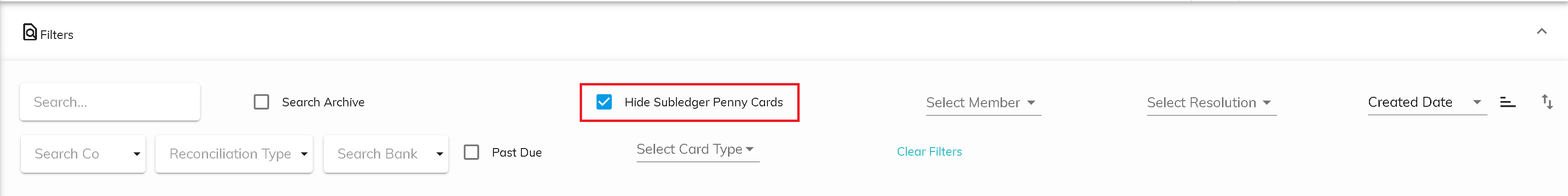 The Hide Subledger Penny Cards filter is on by default. Penny Cards have an amount of between -$0.99 and $0.99. You can see these cards by clicking the checkbox on the filter. There could be a significant number of penny cards that have accumulated and showing these cards could cause the screen to be slower to load.