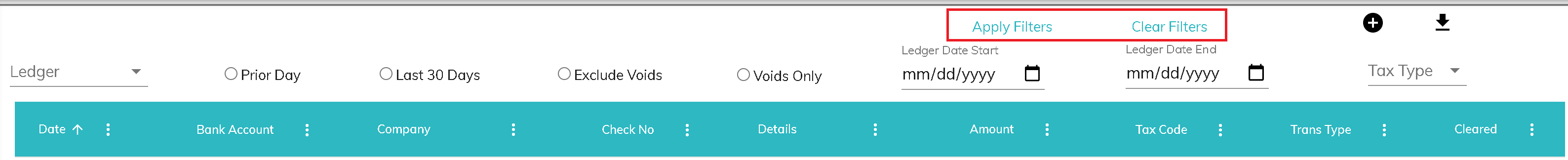 Filters can be used in conjunction with each other. Choose the filters you would like to apply and click the Apply Filters box to search for the transactions(s). Reset the filters by clicking Clear Filters.