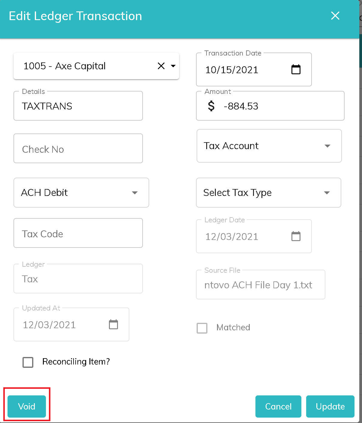If a transaction has not been reconciled in a bank statement, it can be voided using the Edit Ledger screen. From Search Ledger, filter to find the transaction. Click on the row containing the transaction you would like to void. Click Void and confirm that you would like to void the transaction. Voided transactions can be identified on the Search Ledger screen as transactions that are greyed out on the Search Ledger screen.