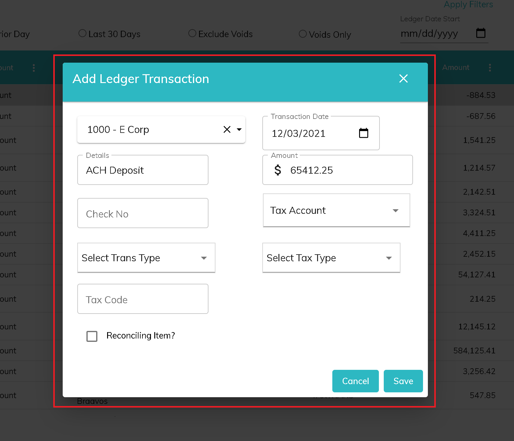 The Add Ledger Transaction screen can also be accessed from Manage Exceptions and from Search Ledger.