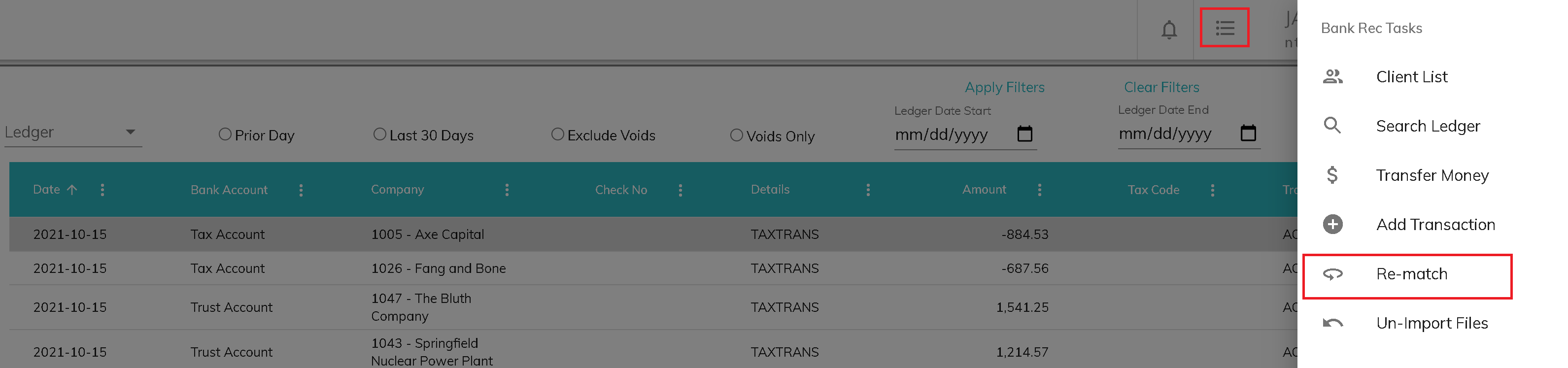There may be times when an incorrect ledger transaction is cleared in a bank reconciliation. Re-match transactions allows you correct a completed bank reconciliation by choosing the correct ledger transaction(s) to clear against a bank transaction. Access the re-match transaction screen under Bank Reconciliation Tasks.
