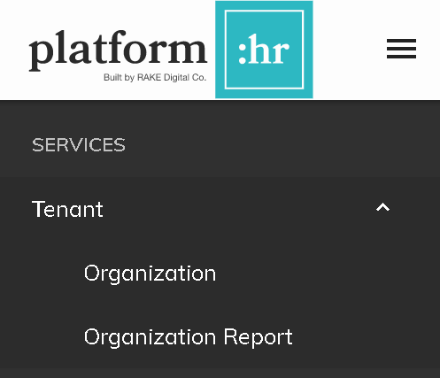 Users with administrative rights will see Tenant Administration in their navigation pane. The submenu items are Organization and Organization Report.