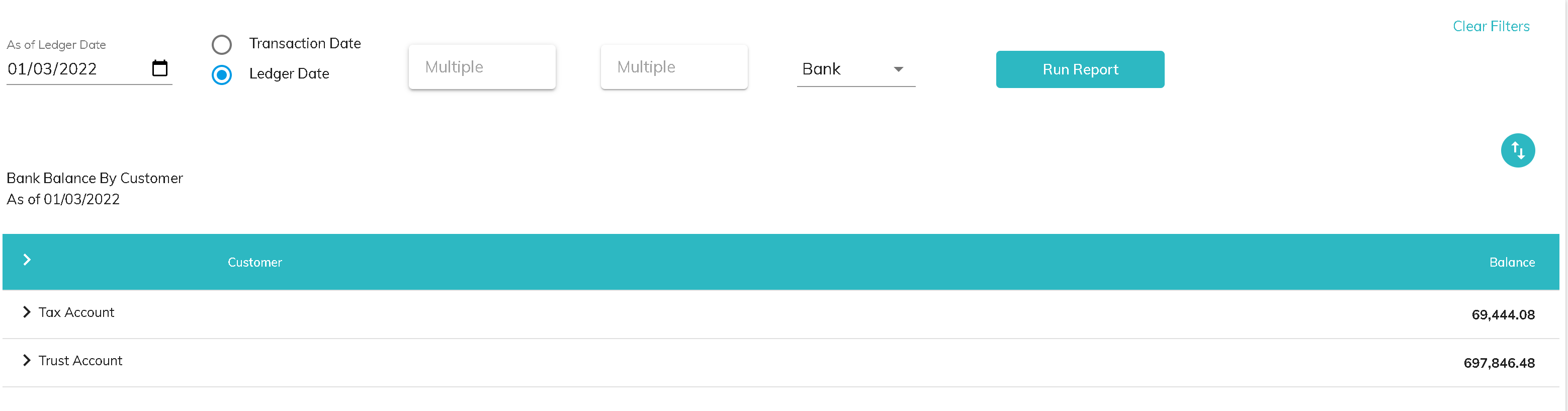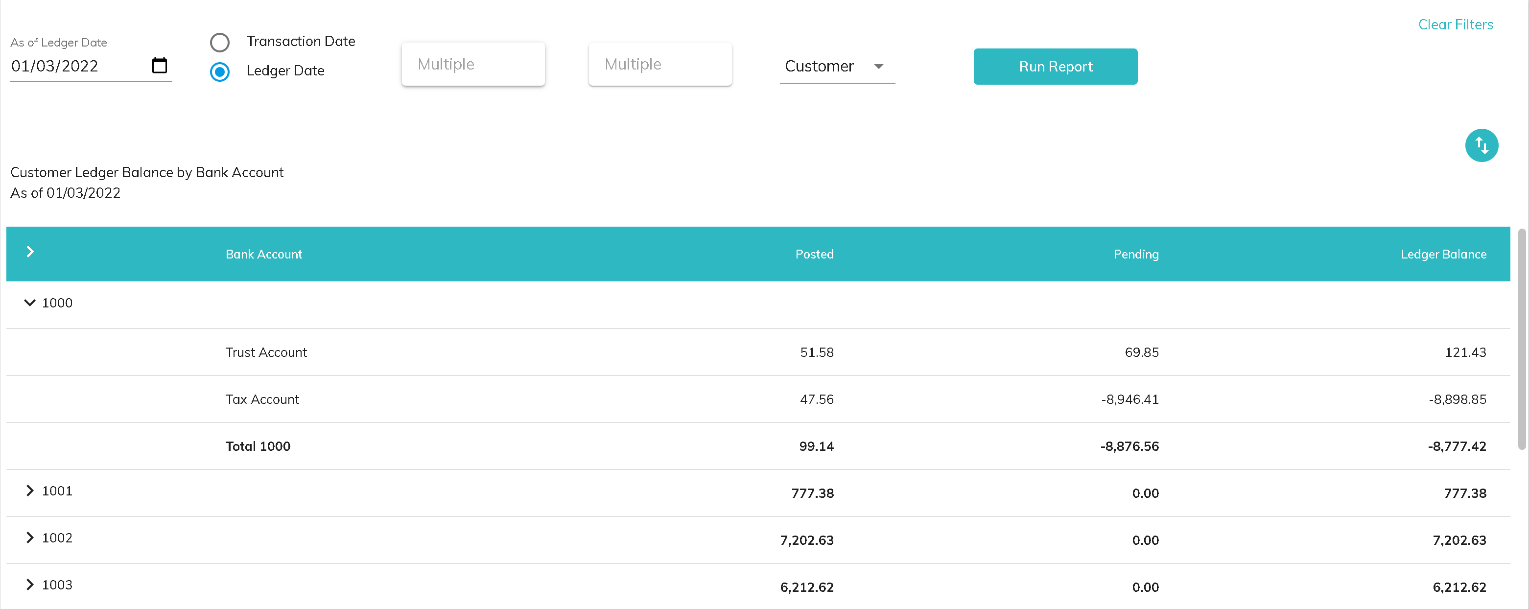 - The bank account name is listed in the first column and can be expanded to show the details by customer