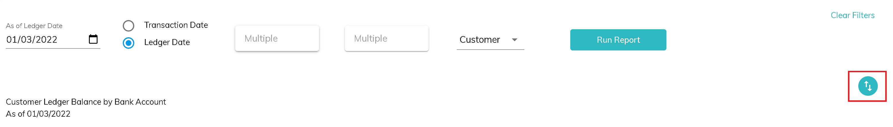 To generate a report showing your customer ledger balance(s) by bank account, configure the following setting on the reports tab: