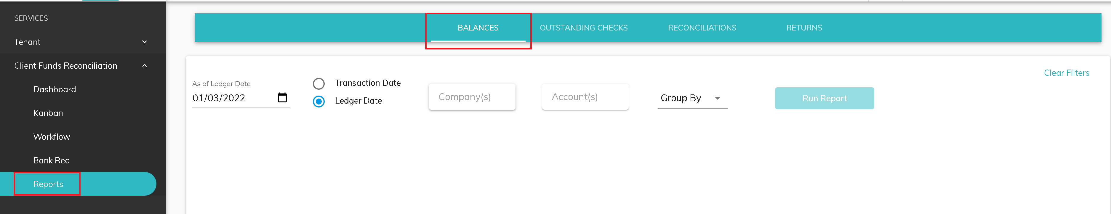 The Balances report allows you to find information about posted and pending transactions for one or more customers and bank accounts.